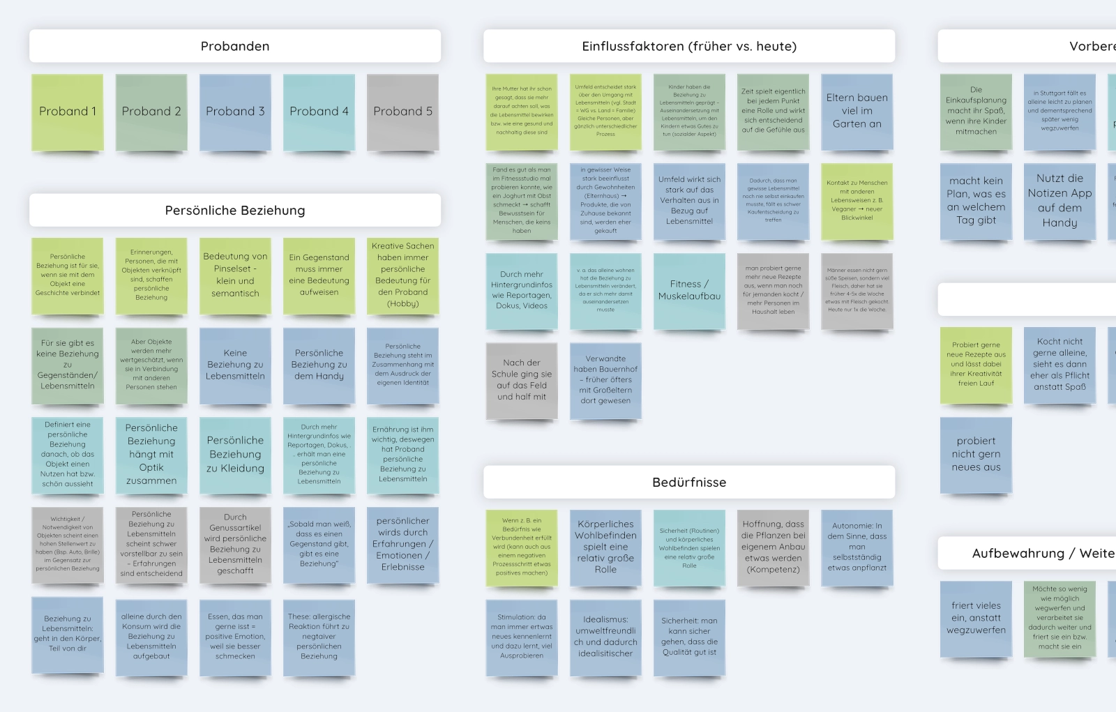 Nach der Durchführung der Interviews haben wir die gewonnenen Erkenntnisse systematisch analysiert. Dabei wurden die relevantesten Aussagen aus den Gesprächen thematisch geclustert und die Experience Maps der einzelnen Teilnehmenden zusammengeführt. Diese Vorgehensweise ermöglichte es uns, Muster und Gemeinsamkeiten im Umgang mit Lebensmitteln zu erkennen, tiefere Einblicke in die Bedürfnisse, Motivationen und Herausforderungen der Nutzenden zu gewinnen und wichtige Problembereiche zu identifizieren.