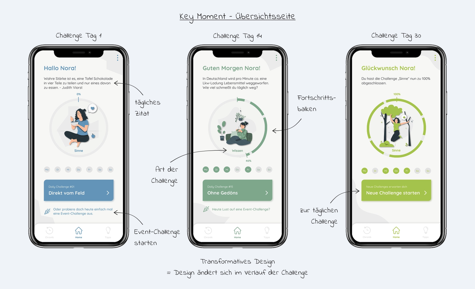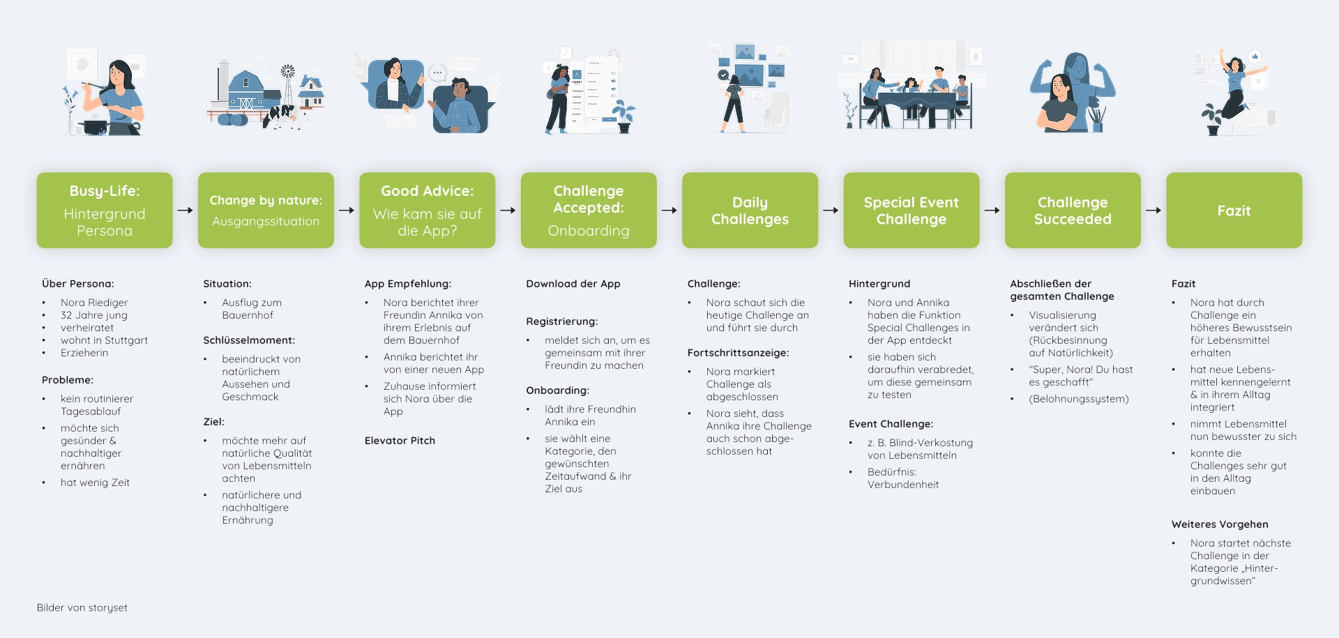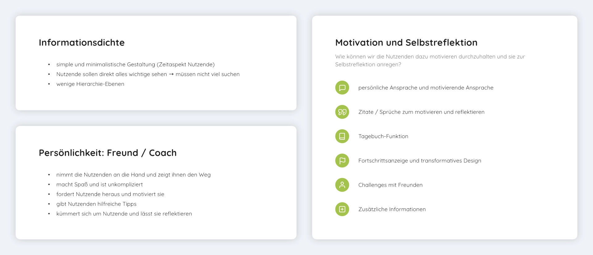 Zur weiteren Verfeinerung des Konzepts definierten wir zentrale Eigenschaften wie die Informationsdichte, den Charakter und die Schlüsselfunktionen der App. Da „Foodish by nature“ eine Challenge-App ist, setzten wir besonderen Wert auf motivierende Elemente und Funktionen zur Selbstreflexion. Zudem war es uns wichtig, den Zeitaspekt zu berücksichtigen, da unsere Zielgruppe hauptsächlich aus berufstätigen Menschen mit begrenzter Freizeit bestand.