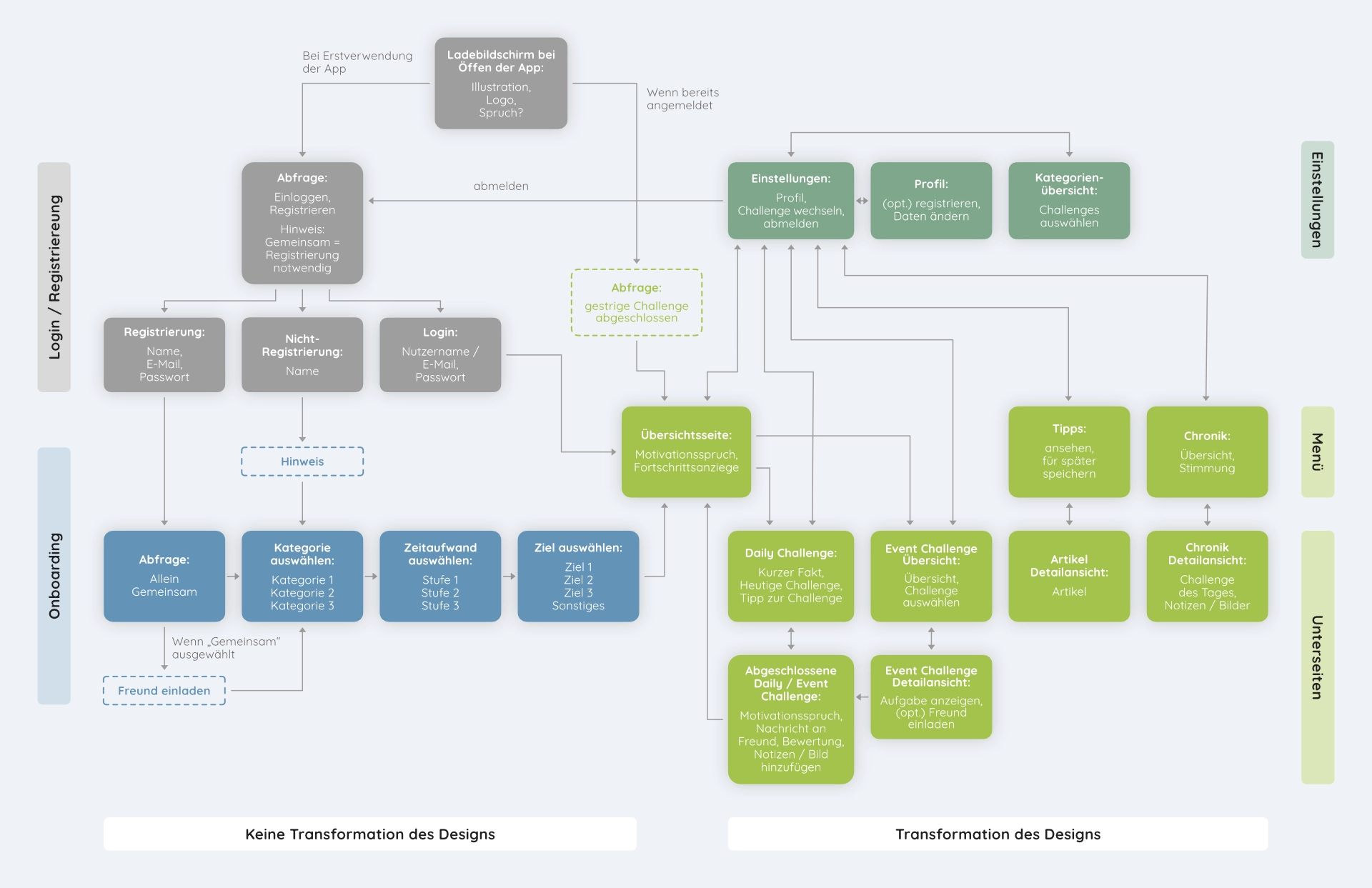 Zeitgleich entwarfen wir einen Interaction Flow. Dieser ermöglichte es uns, einen klaren Überblick über die Inhalte und die Struktur der App zu gewinnen und eine benutzerfreundliche Navigation zu gewährleisten, die das Nutzererlebnis intuitiv und effizient gestaltet.