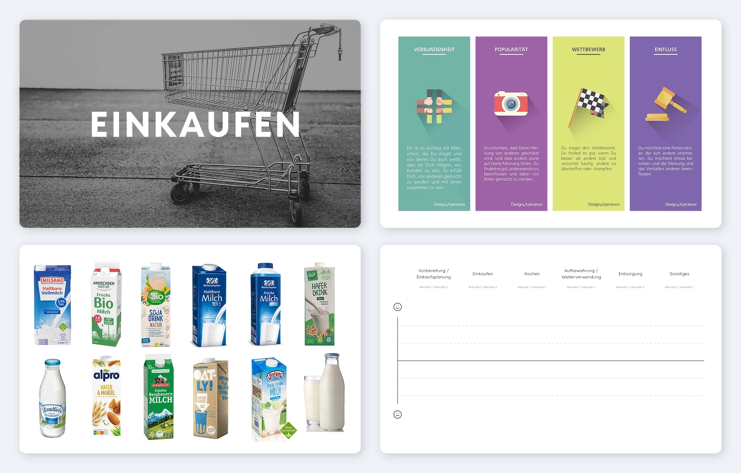 Die Interviews dauerten jeweils etwa zwei Stunden und fanden je nach Möglichkeit entweder vor Ort oder online via Zoom statt. Zu Beginn der Befragung stellten wir allgemeine Fragen zu den Einstellungen und Gewohnheiten der Teilnehmenden in Bezug auf Lebensmittel. Anschließend begleiteten wir sie gedanklich durch den gesamten Prozess ihres Umgangs mit Lebensmitteln. Um tiefere Einblicke zu gewinnen, setzten wir Bedürfniskarten sowie Produktbilder als Gesprächsimpulse ein und nutzten eine vereinfachte Experience Map, in der die Gefühle der Teilnehmenden zu den verschiedenen Phasen des Prozesses festgehalten wurden.