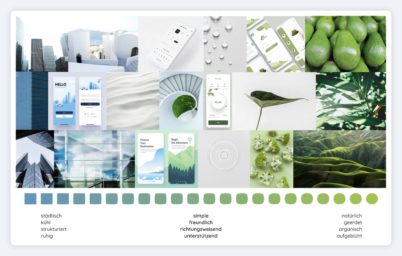 Im nächsten Schritt erstellten wir ein Moodboard, um das visuelle Design von „Foodish by nature“ zu definieren. Die App zeichnet sich durch eine klare, freundliche und richtungsweisende Gestaltung aus. Ein zentrales Konzept war, dass sich das Design im Verlauf der Nutzung gemeinsam mit den Nutzenden entwickelt und deren zunehmende Wertschätzung für natürliche Lebensmittel widerspiegelt. Zu Beginn einer Challenge vermittelt die App eine urbane, ruhige Atmosphäre, die sich im Laufe der Nutzung zu einer natürlicheren und organischeren Ästhetik wandelt.