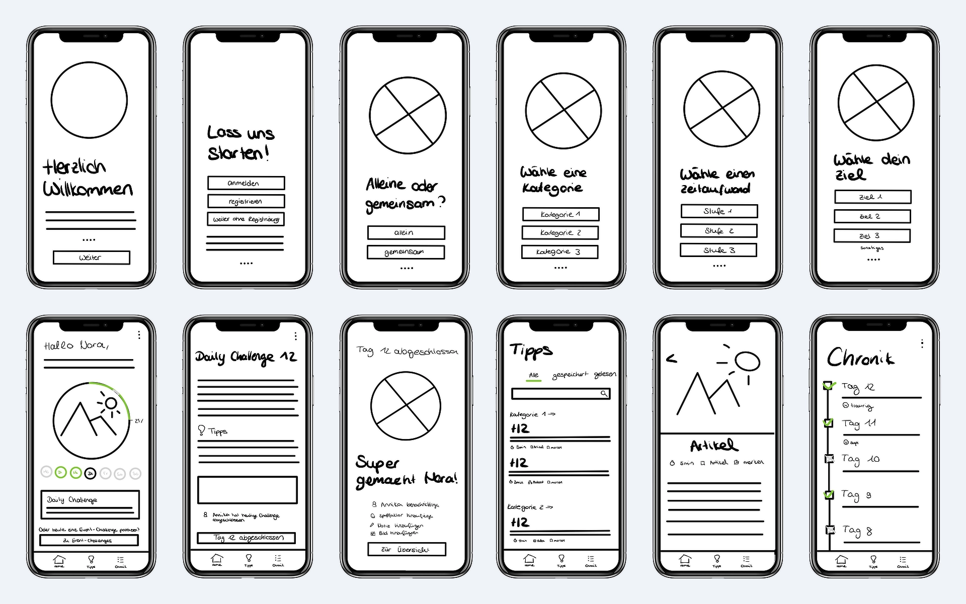 Nach der Festlegung der grundlegenden Struktur und der wichtigsten Funktionen der App erstellten wir erste händische Wireframes. Diese halfen uns dabei, die konkreten Inhalte der einzelnen Seiten sowie deren Anordnung und Platzierung zu visualisieren und sicherzustellen, dass die App eine klare und benutzerfreundliche Struktur aufweist, bevor wir in die detaillierte Gestaltung übergingen.